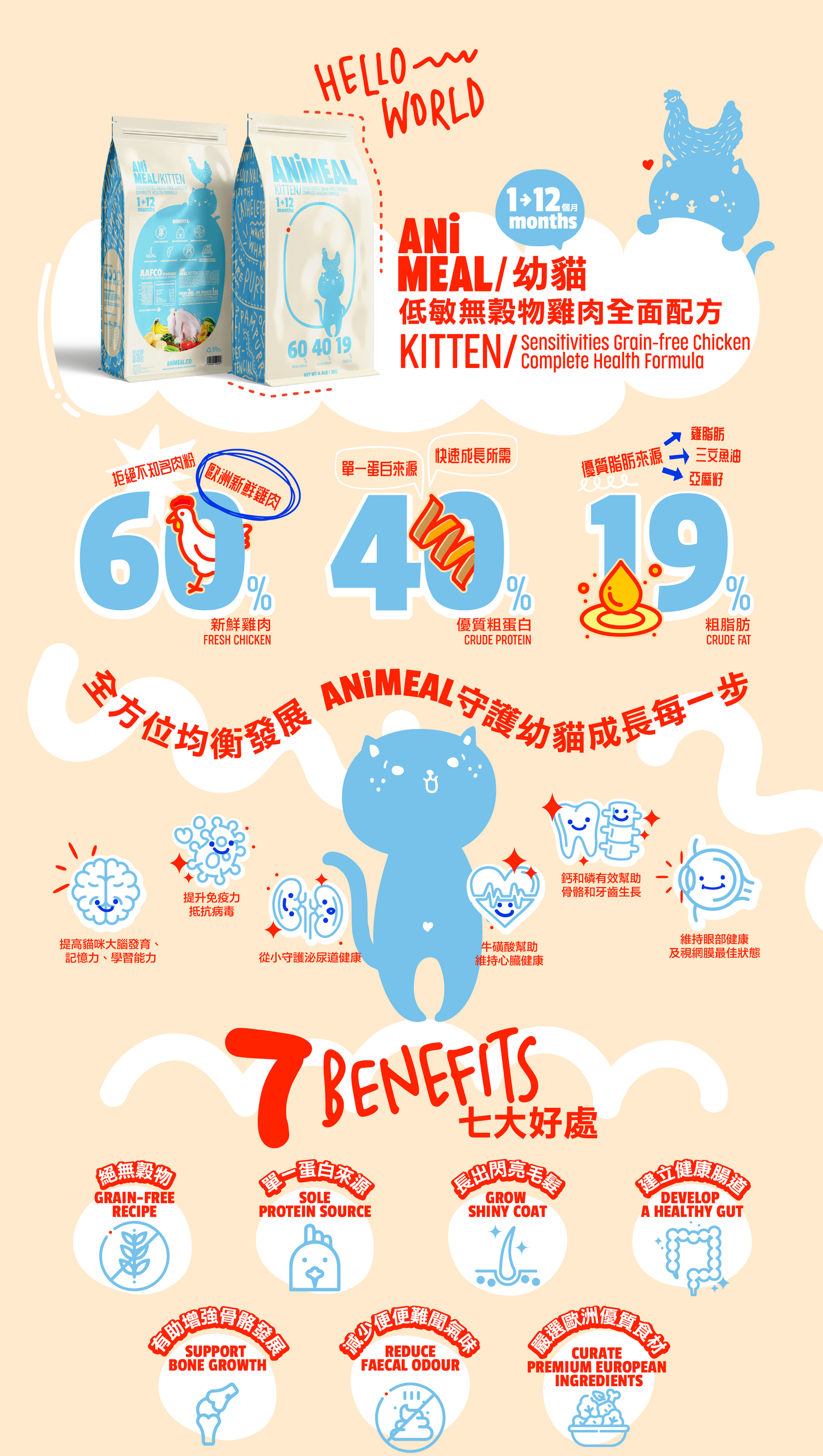 _40%優質粗蛋白+19%優質粗脂肪,支援幼貓發育期高營養需求