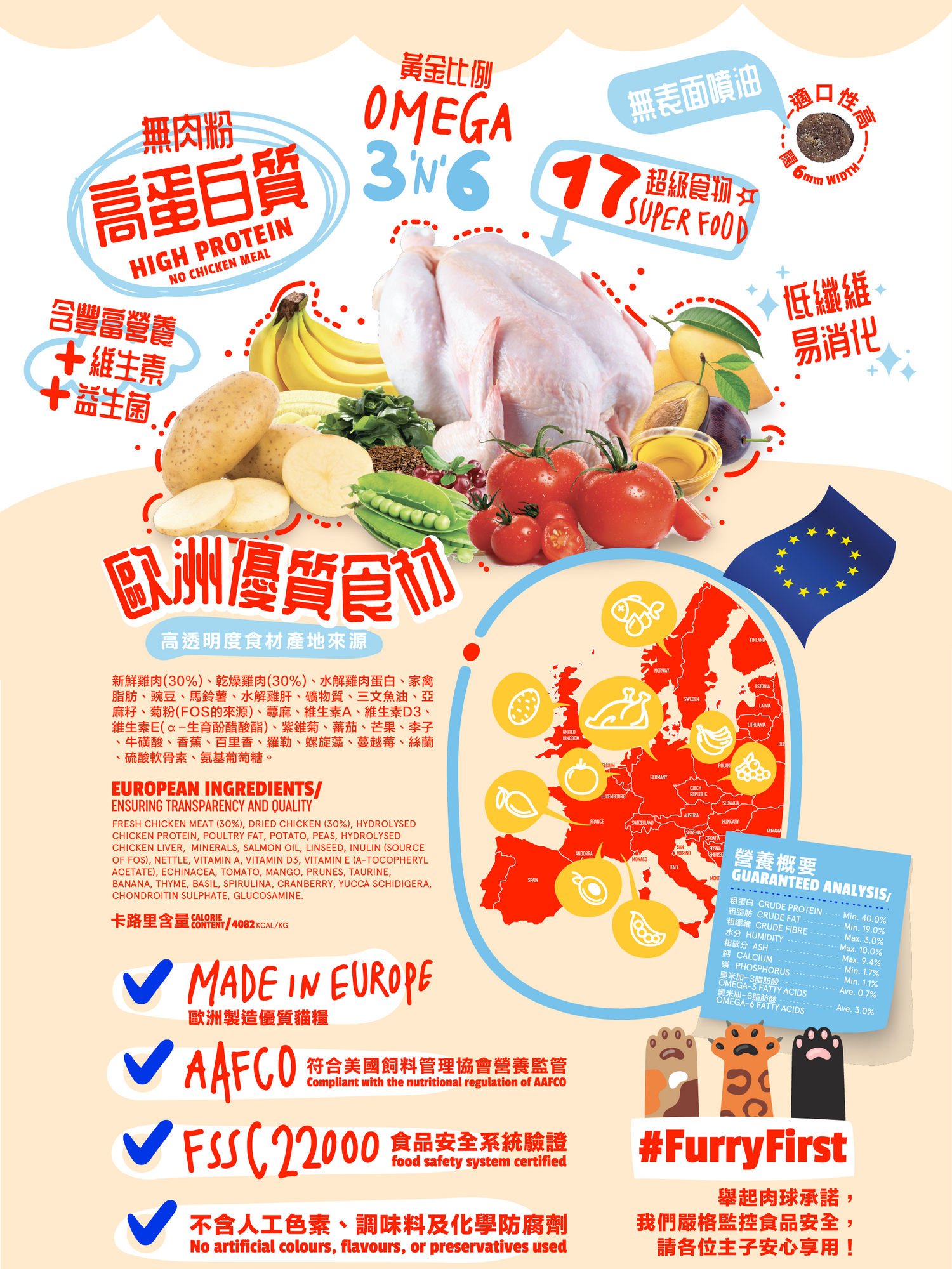 _採用60%歐洲原產地新鮮雞肉,含肉量高,以新鮮肉類為基礎,提供優良高蛋白質和脂肪​ _低敏配方,絕無穀物,單一蛋白來源