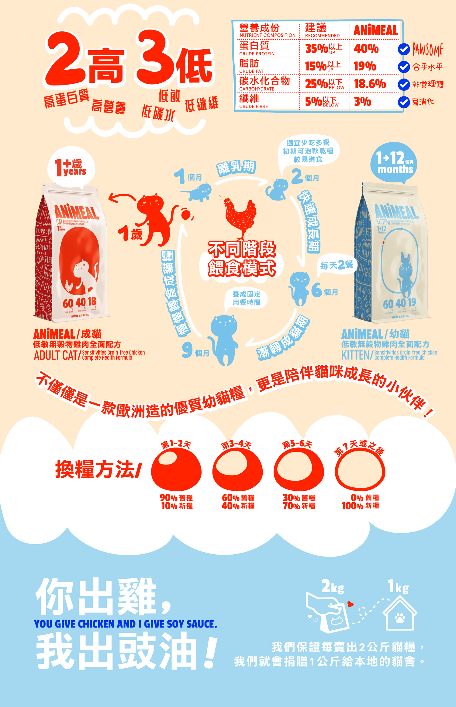 ANiMEAL的貓糧是優質香港品牌,而產品由歐洲製造。例如新鮮雞肉就來自荷蘭/比利時/德國等地,三文魚有來自挪威,番茄、芒果、西梅、香蕉均來自歐洲,確保成分來源及質素穩定,餵食的安心,進食的開心。